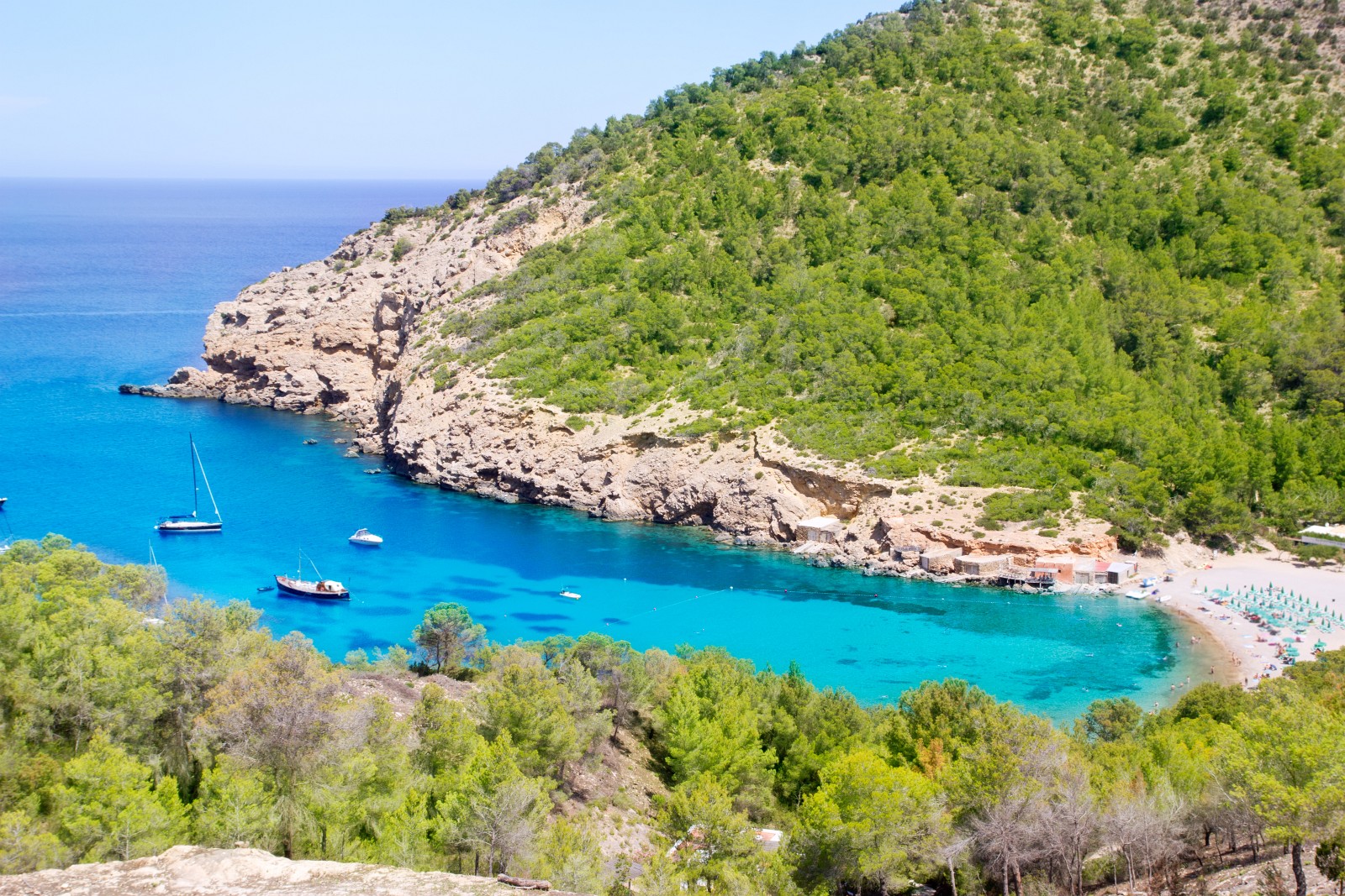 The beach owes its fame not only to its natural beauty, but also to its special bohemian and hippie atmosphere, which manifests itself especially at sunset on Sundays, when dozens of drummers gather on the beach to greet the setting sun behind Cap Bernat, creating a magical and unforgettable experience. The islet of Cap Bernat, the sacred rock of the hippies, lies at the entrance to the bay and at sunset, when everything is tinged with fiery hues, makes the view even more unique.