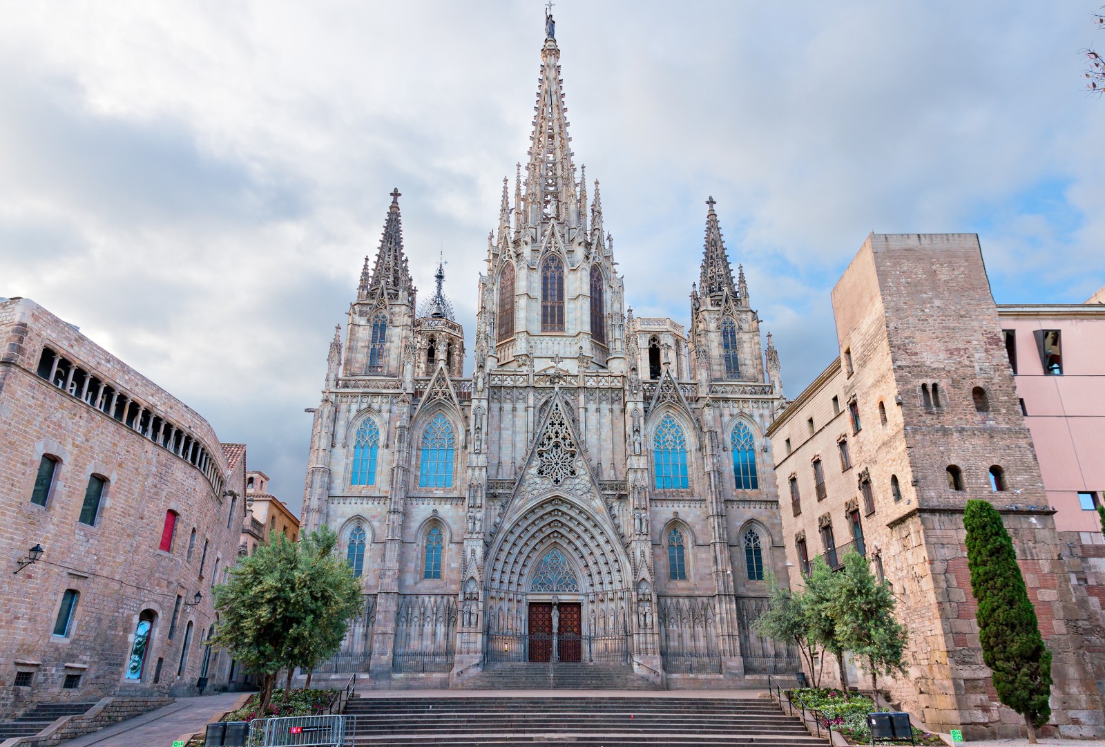 The Gothic façade of Barcelona Cathedral was finished much later, only in 1889, and the last part, the central spire, was completed in 1913. The design of both the façade and the spire was based on the original 1408 drawing by French architect Charles Galters.