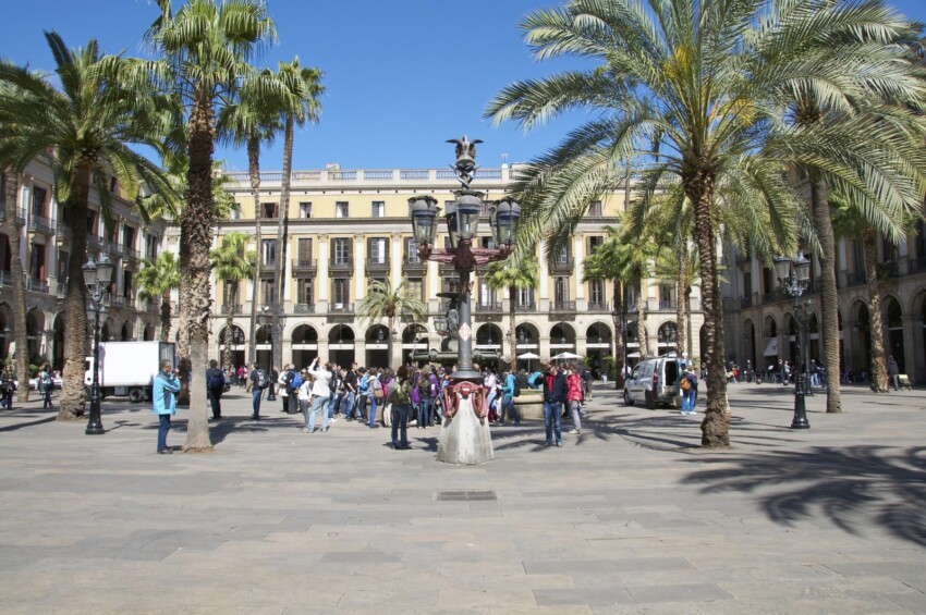 In the centre of the square, always crowded with tourists during the day and also with locals in the evening, there is a fountain with the Three Graces, while the lampposts were designed by a very young Gaudi at the end of the 19th century.