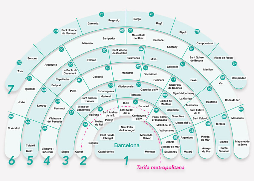 La tarjeta de transporte que utilices debe cubrir tantas zonas como viajes, hasta un máximo de 6 zonas. El centro de Barcelona se encuentra en gran parte dentro de la Zona 1. Por ejemplo, para ir de Barcelona (Zona 1) a Sitges (Zona 3A) tienes que comprar un billete válido para tres zonas.