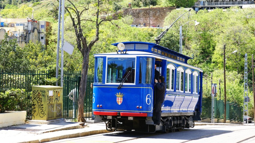 El Tramvia Blau es uno de los antiguos tranvías que circulaban por Barcelona, con un interior de madera anticuado y campanas de mano.