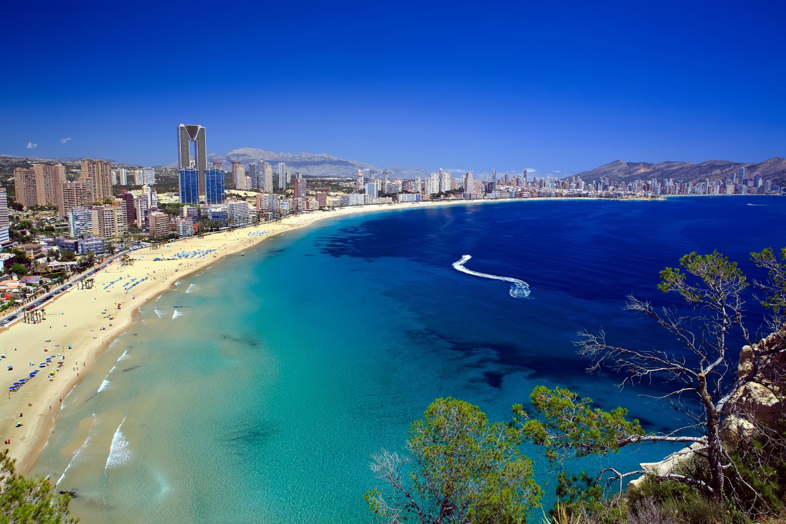 La Playa de Poniente de Benidorm, una larguísima playa de arena fina y aguas transparentes, es una de las playas urbanas más bonitas de España.