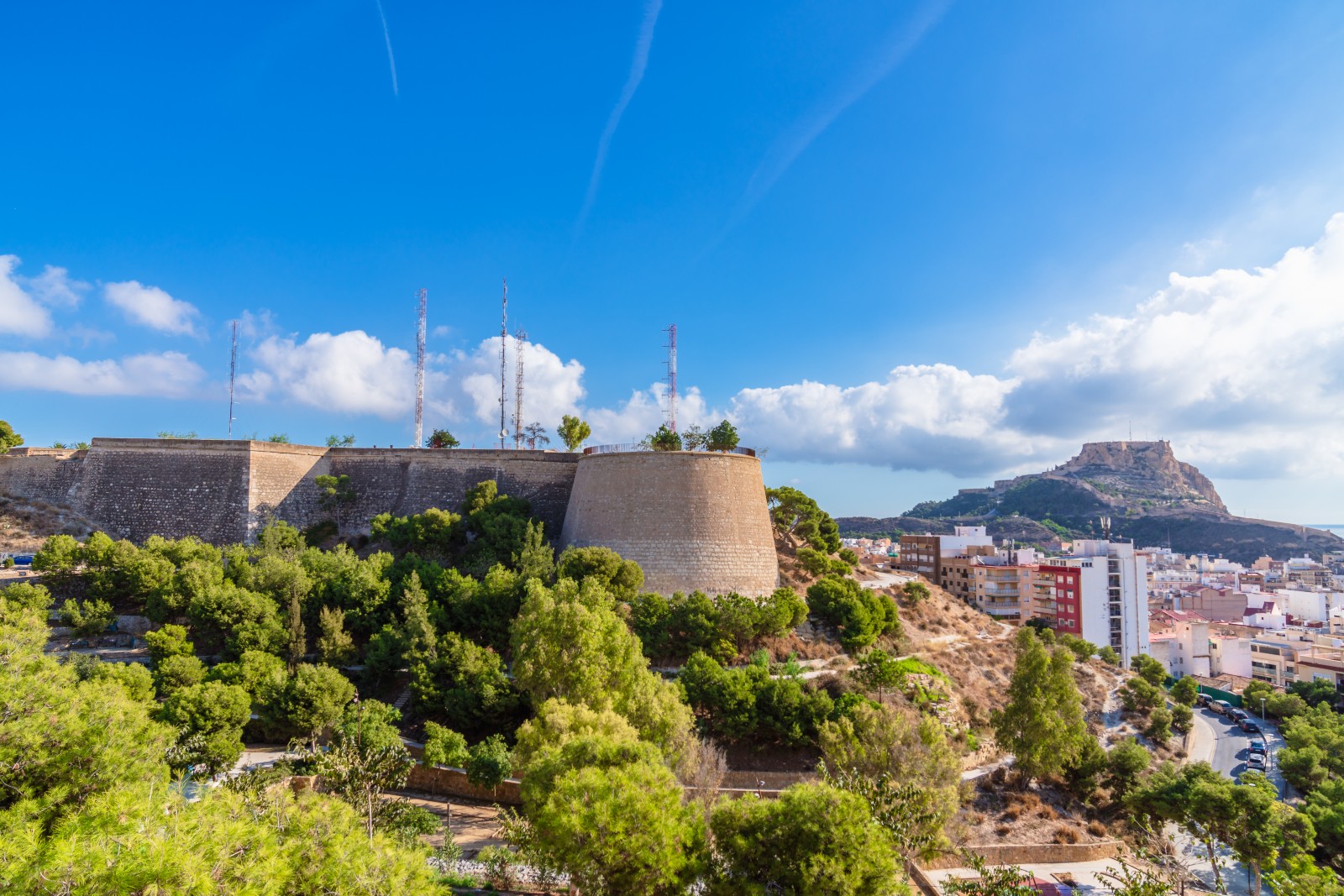 Depuis l’Esplanada de Espana, il faut moins de 10 minutes en voiture pour rejoindre le château de San Fernando: continuez sur la Rambla de Mendez Nunez jusqu’à l’arrêt de tram Mercat, puis tournez à gauche sur l’Avenida Alfonso El Sabio et à droite dans la Calle Belando, qui devient après quelques pâtés de maisons la Calle Maestro Barbieri. Suivez-la jusqu’au pied de la colline du château et, en suivant la rue, vous arriverez au parking.